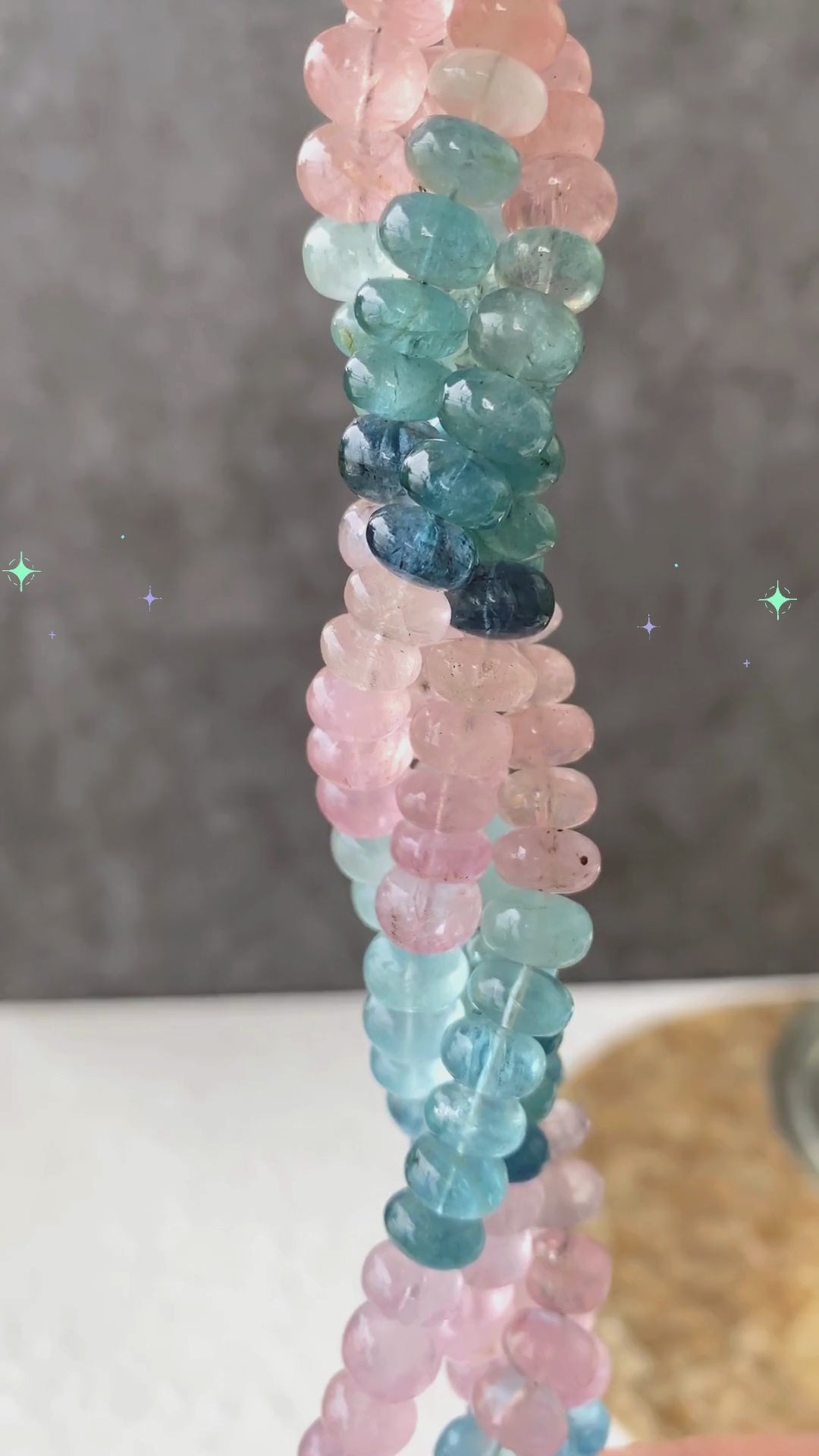 A gradient mix of aquamarine, which has a refreshing pale blue to blue-green color, and morganite, which has a variety of hues from rose pink to peach. It's amazing how the two colors blend together to calm the mind.